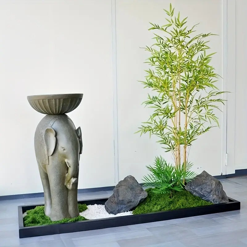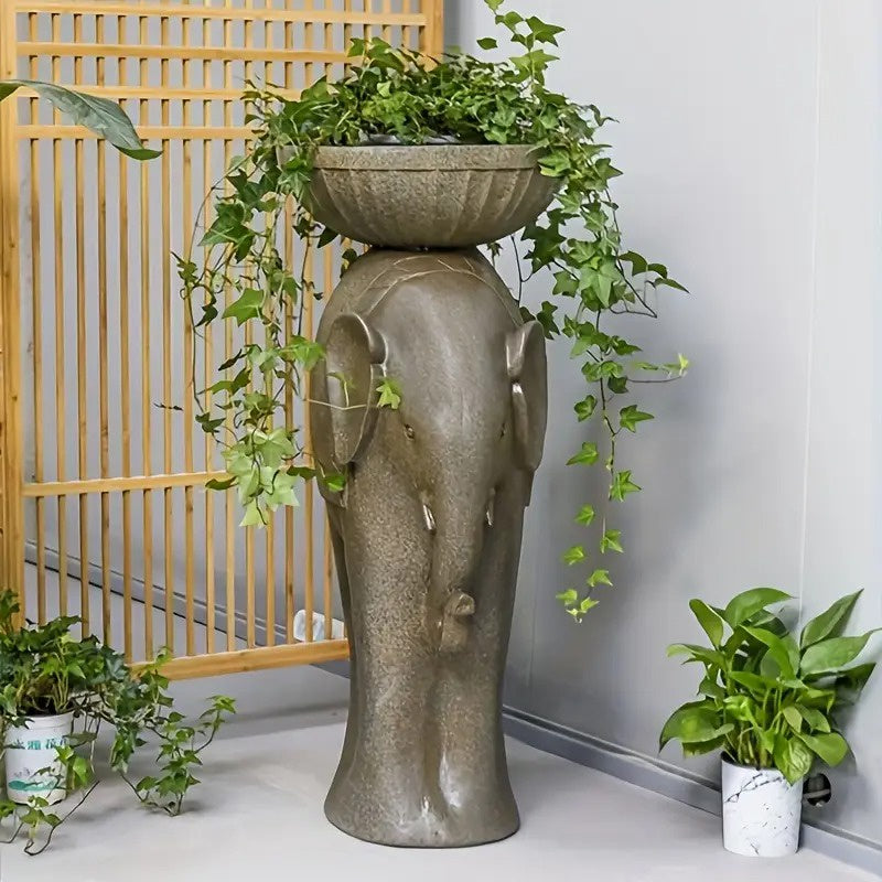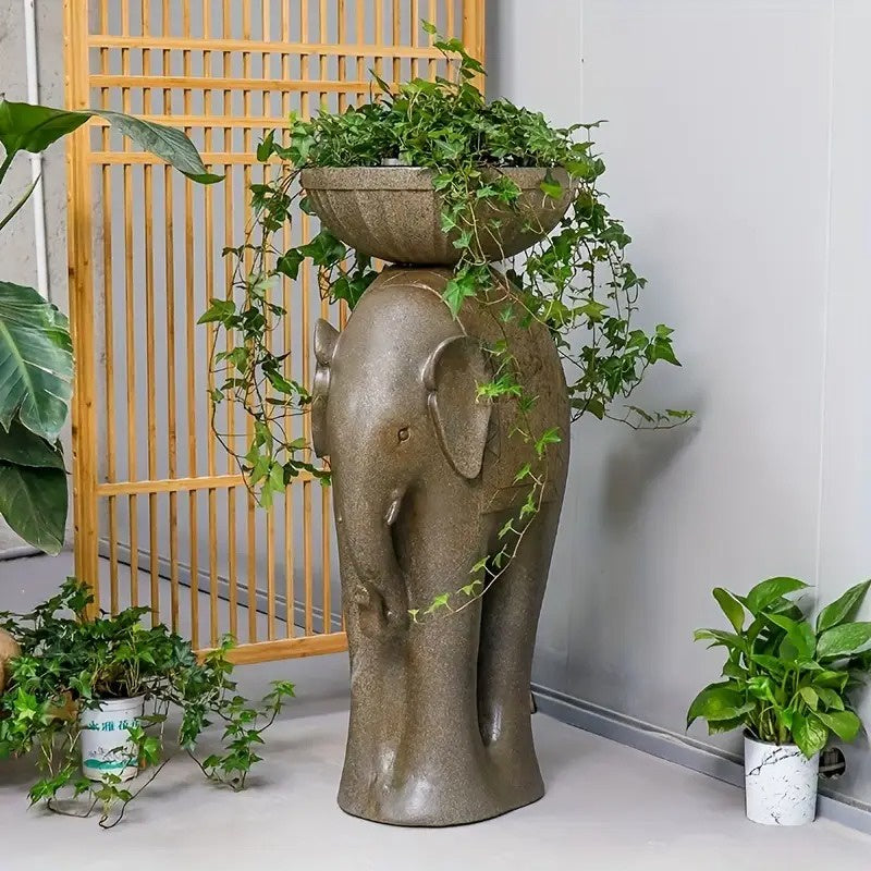 Ten planter ma kształt słonia. Rzeźba posiada misę umieszczoną na grzbiecie słonia, która umożliwia sadzenie roślin. Może pomieścić małe krzewy, kwiaty lub inne rośliny mieszczące się w misie. Ten planter w kształcie słonia nadaje się do ustawienia na zewnątrz.