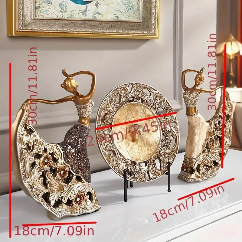 Ten dekoracyjny zestaw z żywicy do ekspozycji wewnętrznej obejmuje dwie figurki kobiece oraz pasujący talerz dekoracyjny. Każda figurka przedstawia kobietę w tanecznej pozie. Zestaw zawiera również talerz dekoracyjny z centralnym motywem kwiatowym.